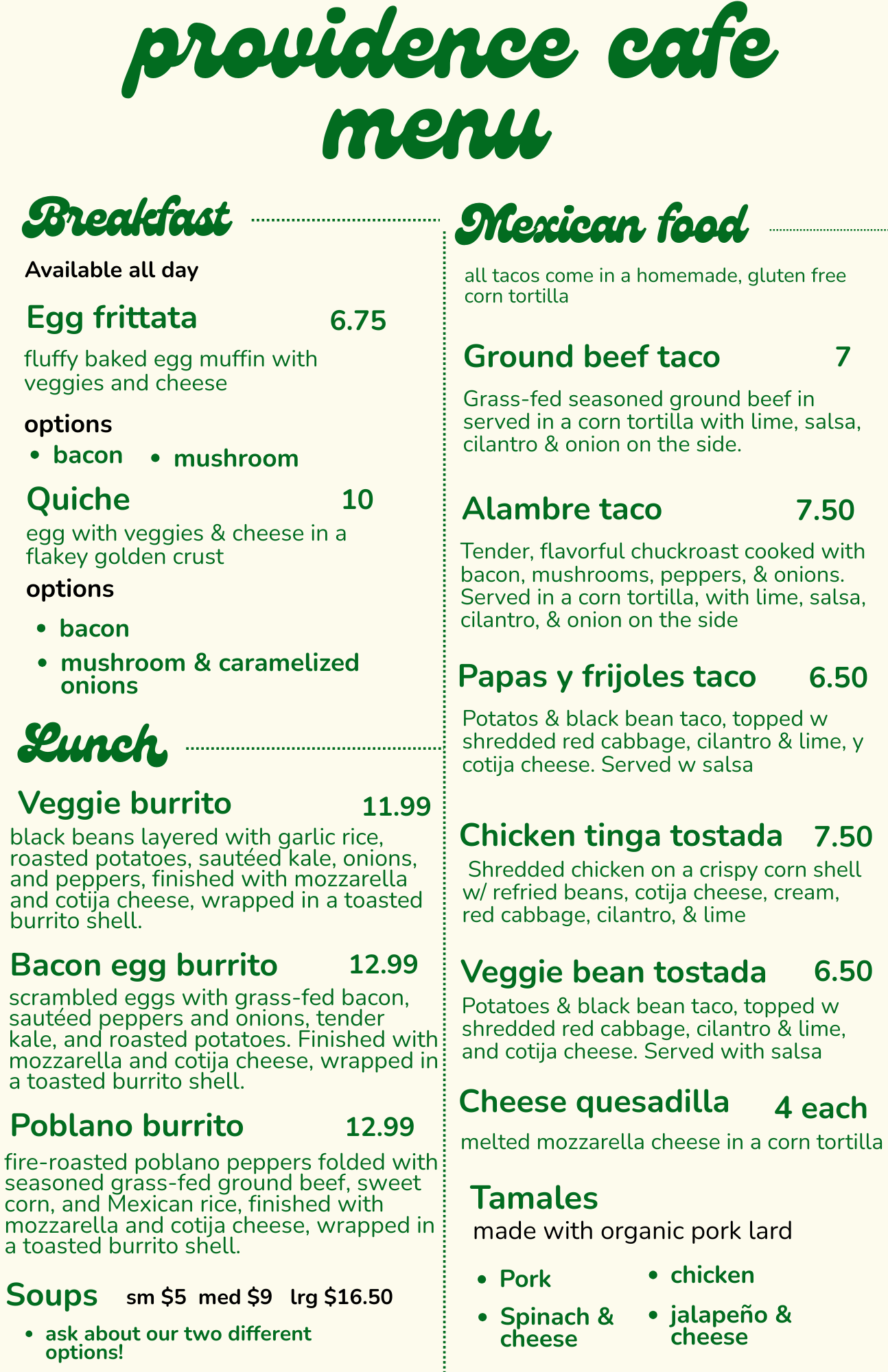 Every Saturday (10-5:00) we feature Mexican food made in our kitchen. Our pop-up menu changes periodically, but we offer tacos and tamales regularly